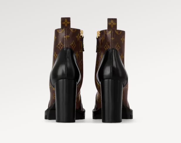 The Star Trail ankle boot, one of Louis Vuitton's most instantly recognisable designs, is interpreted in patent Monogram canvas for a truly iconic look. Black calf leather trim brings a chic twist to this army-inspired style with its leather laces and rugged platform sole.